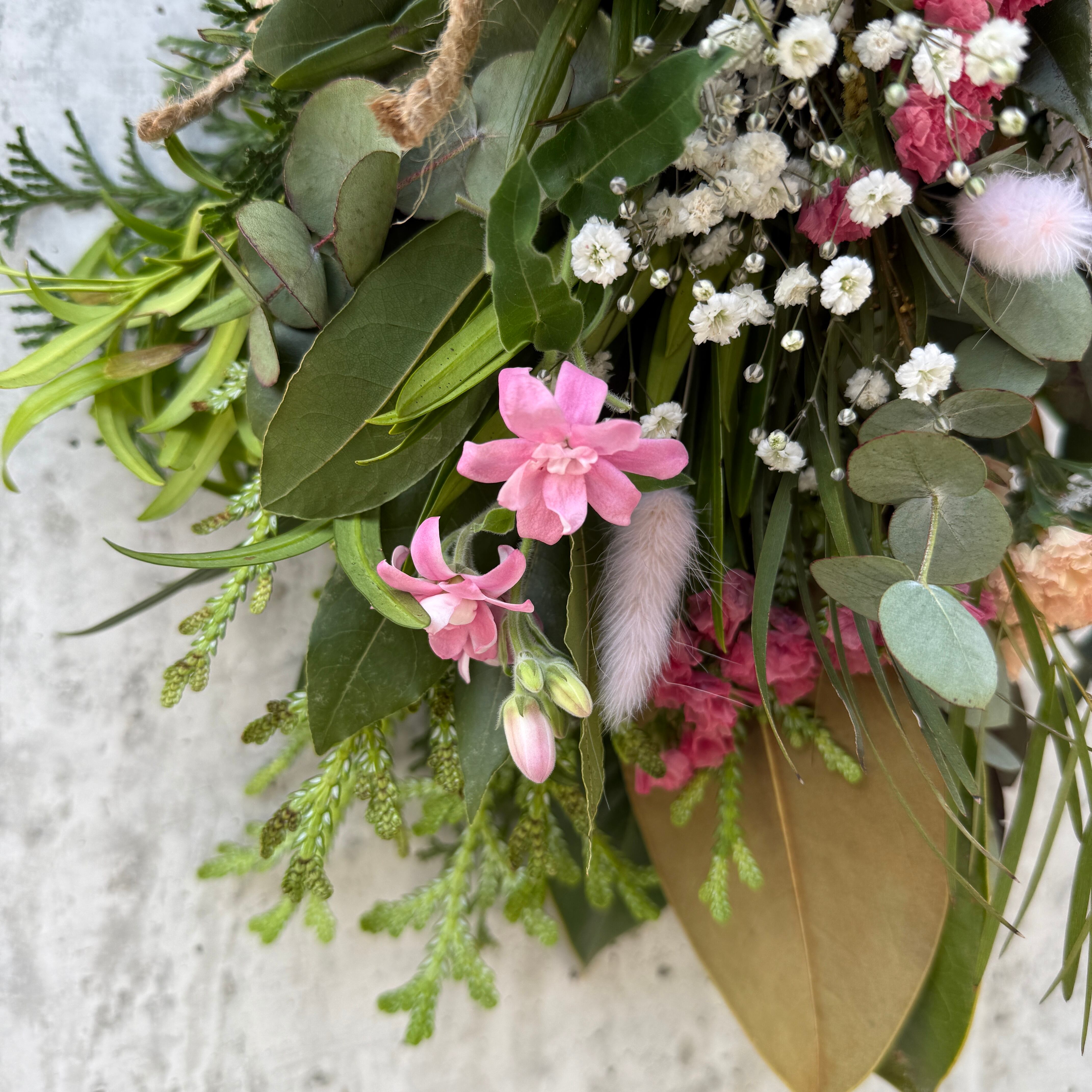 ピンク系の花材を使った春限定のGreenスワッグ。