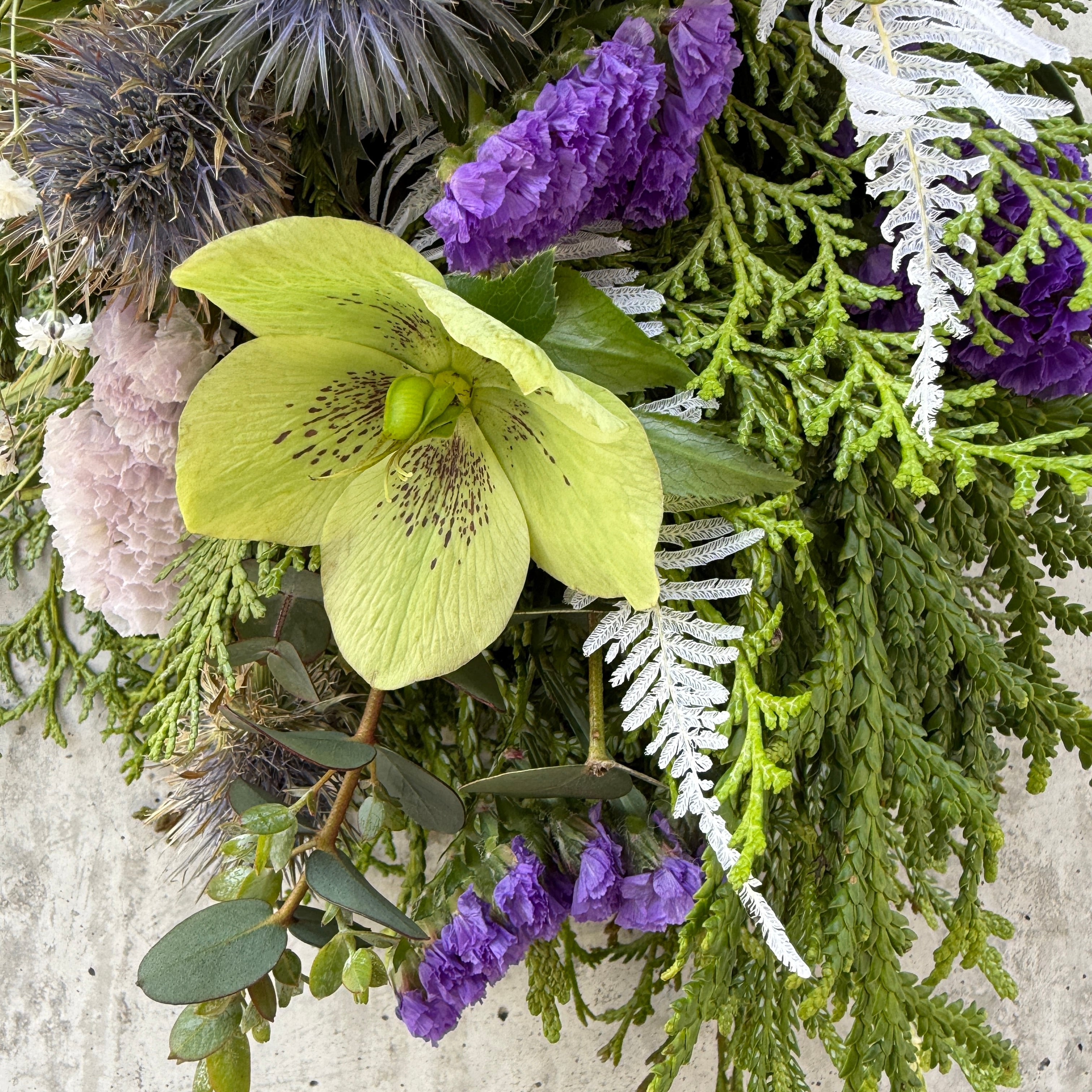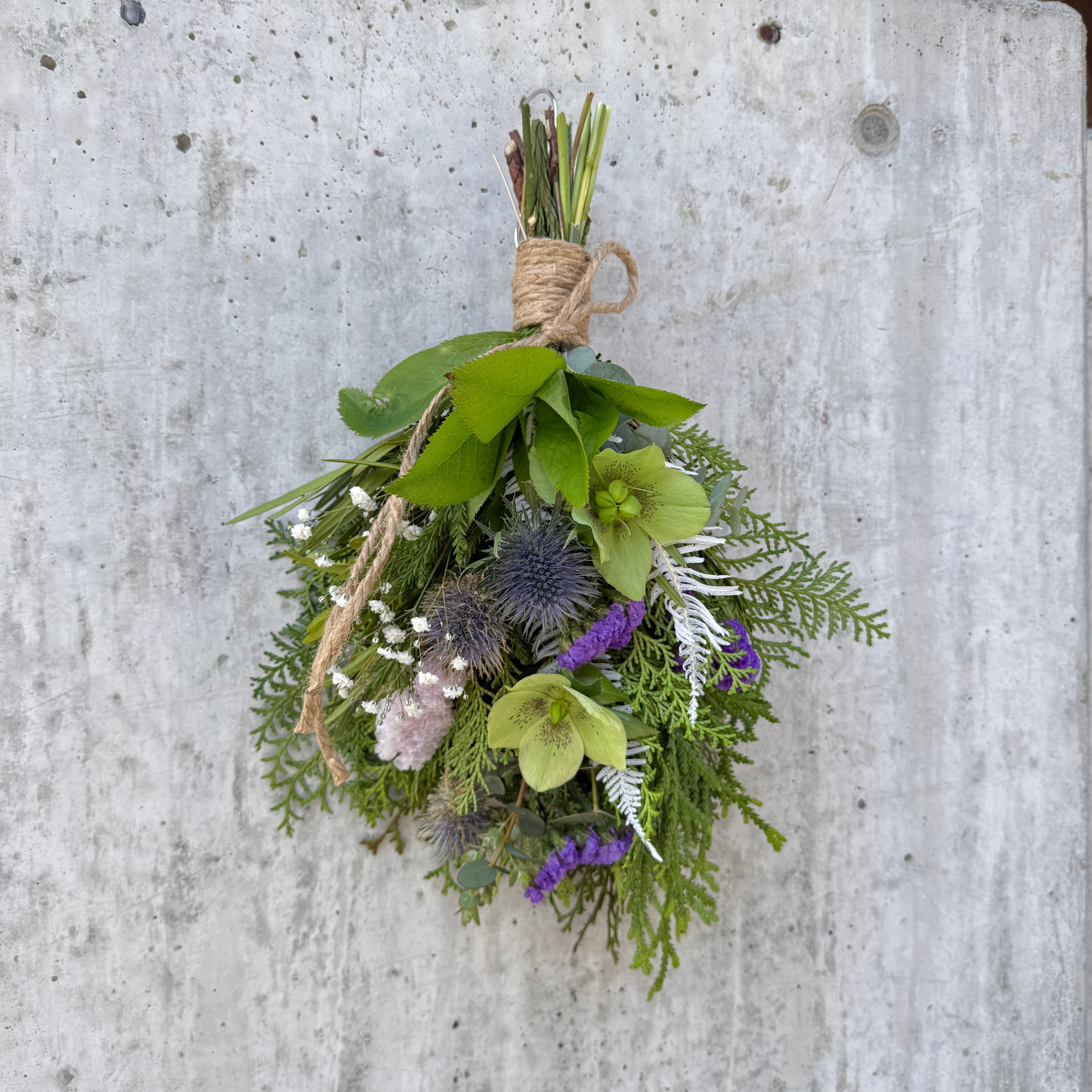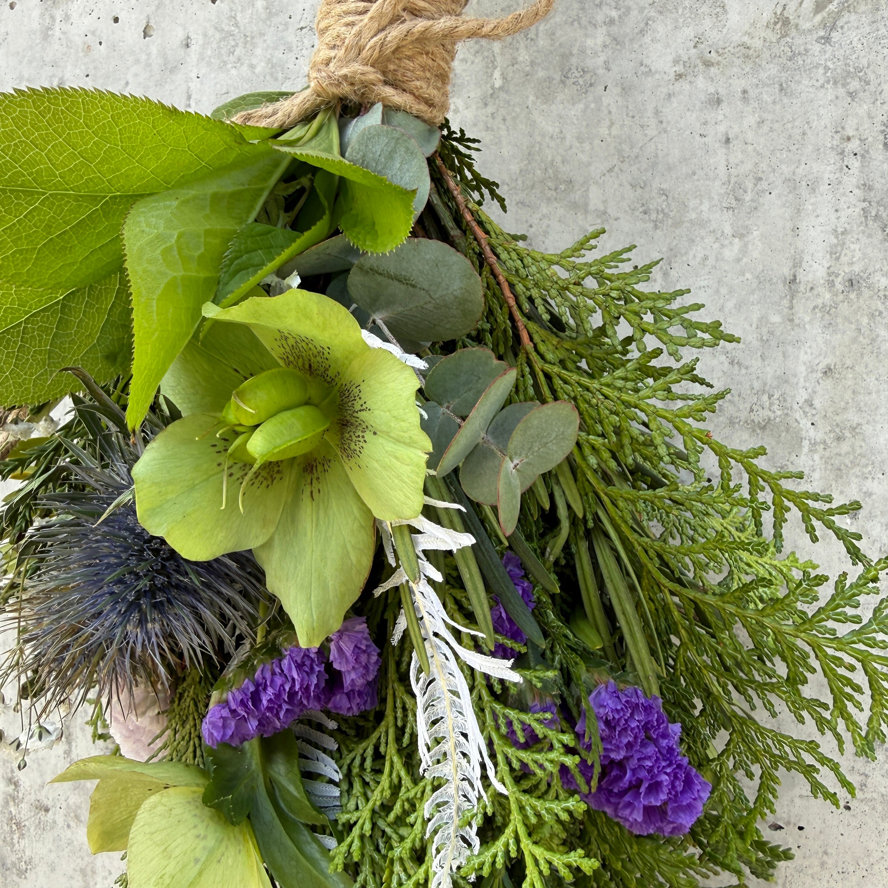クリスマスローズ、スターチスやカスミソウなど春の雰囲気を演出する花材を使って、青〜紫系の色味に仕上げました。