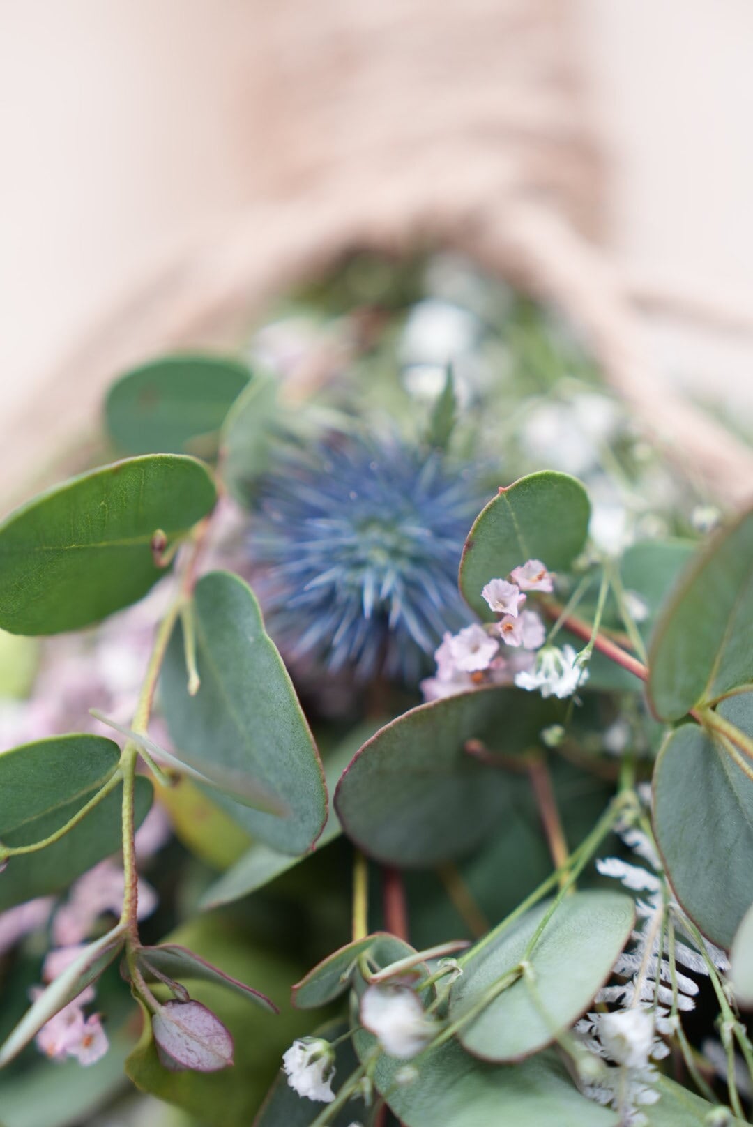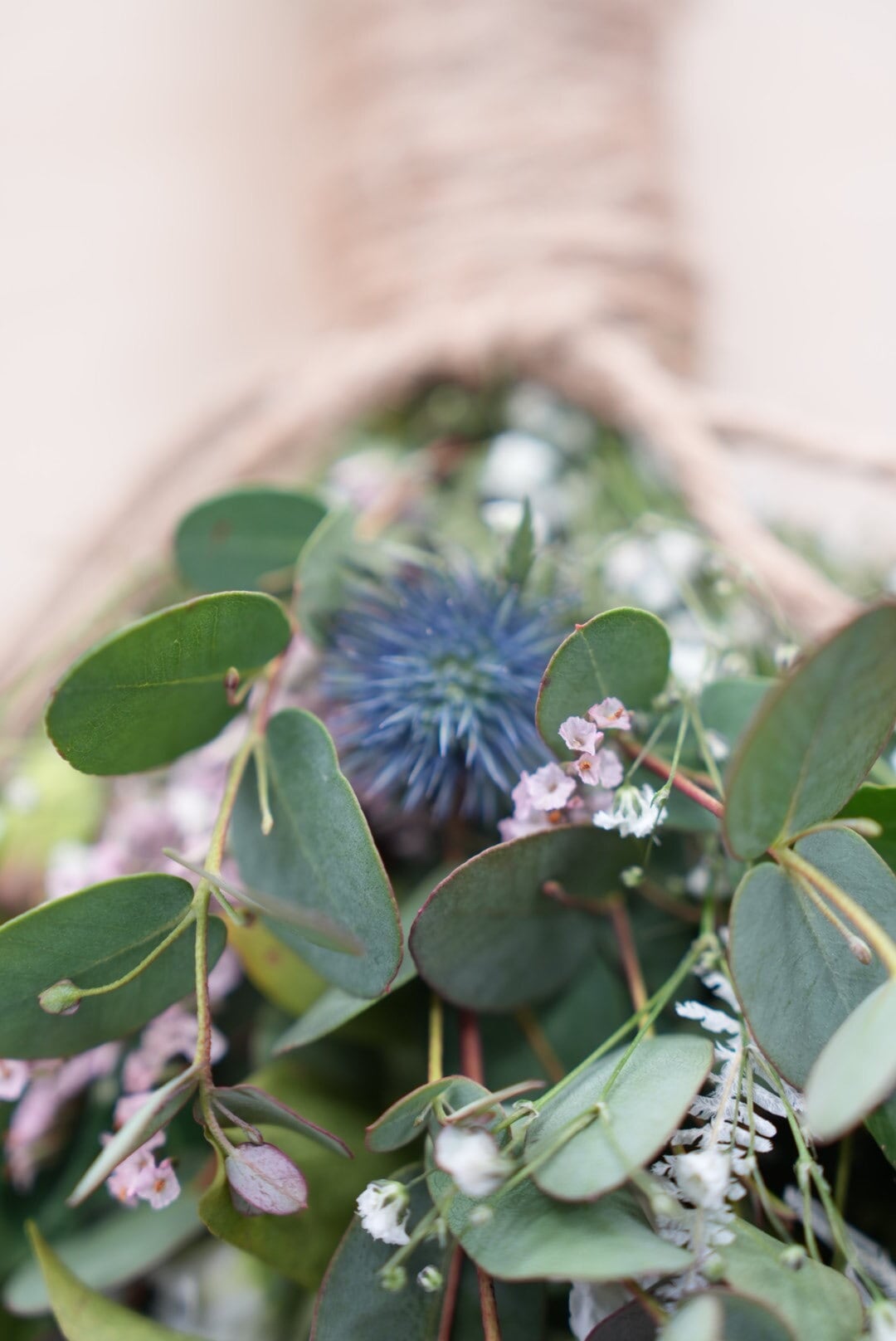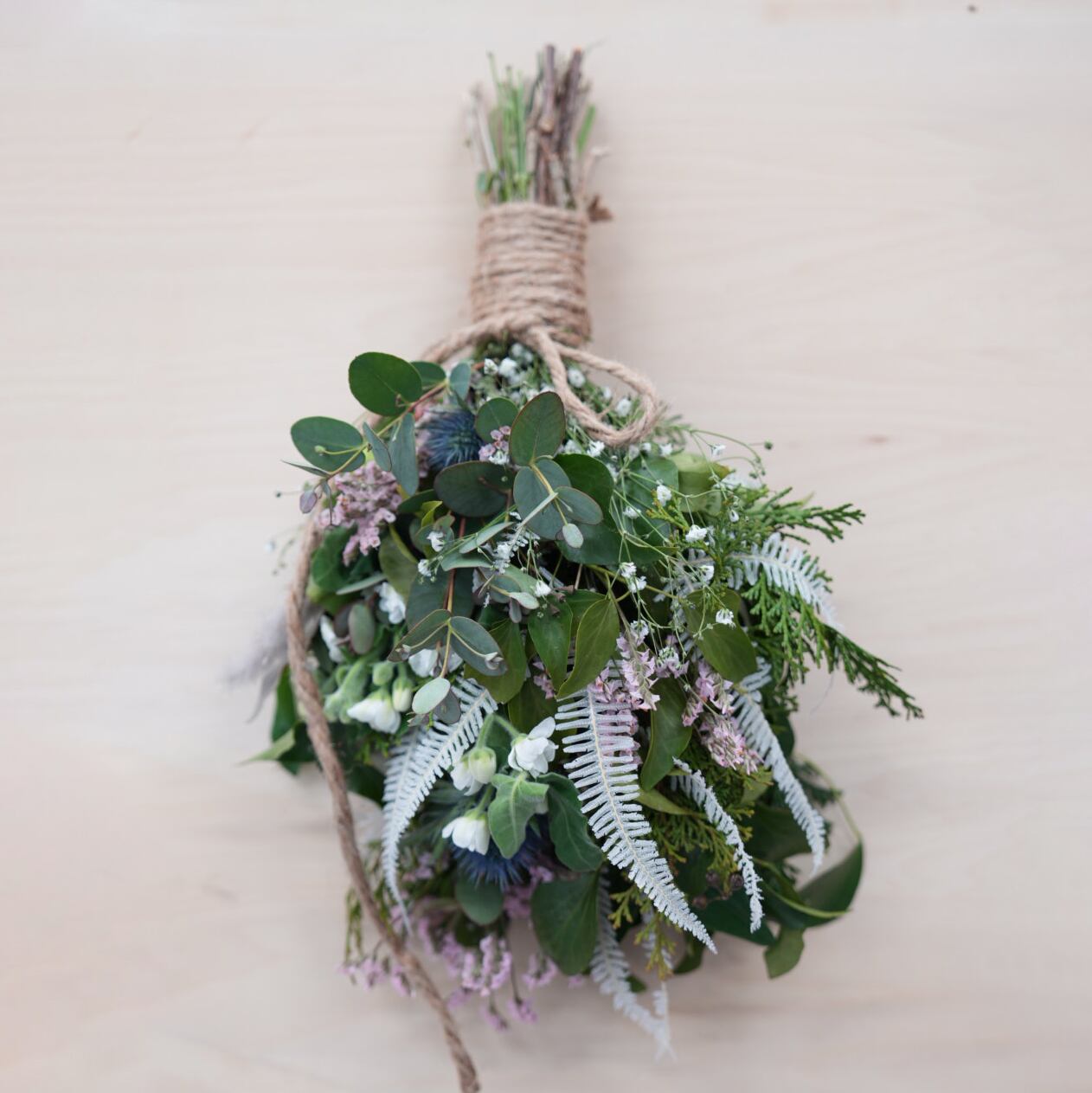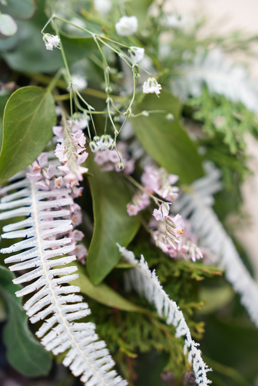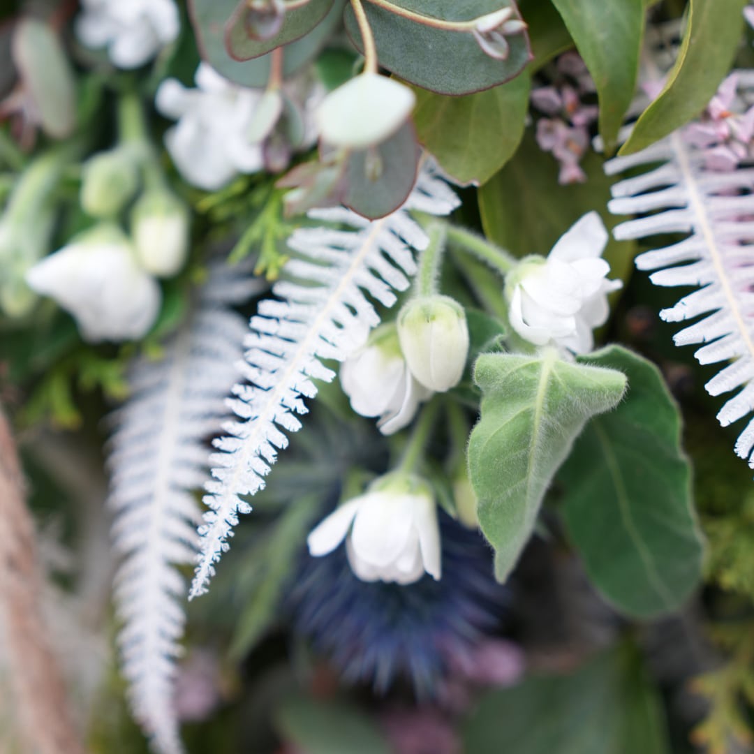 グリーンの葉っぱベースには、檜、ユーカリ、ヘデラなどを詰め込んで、